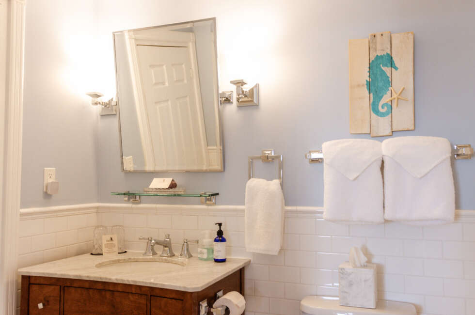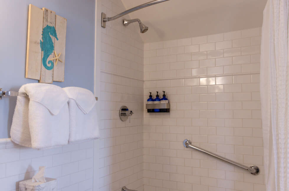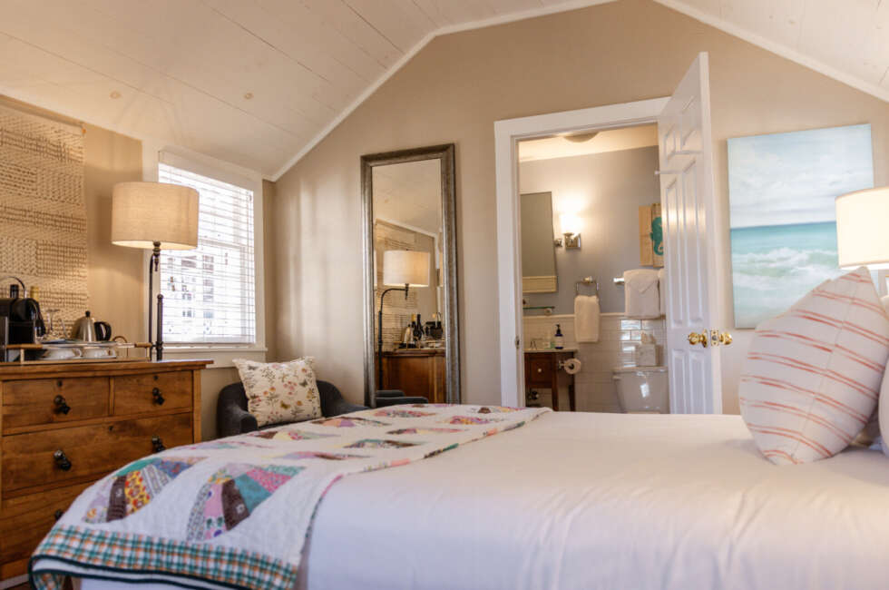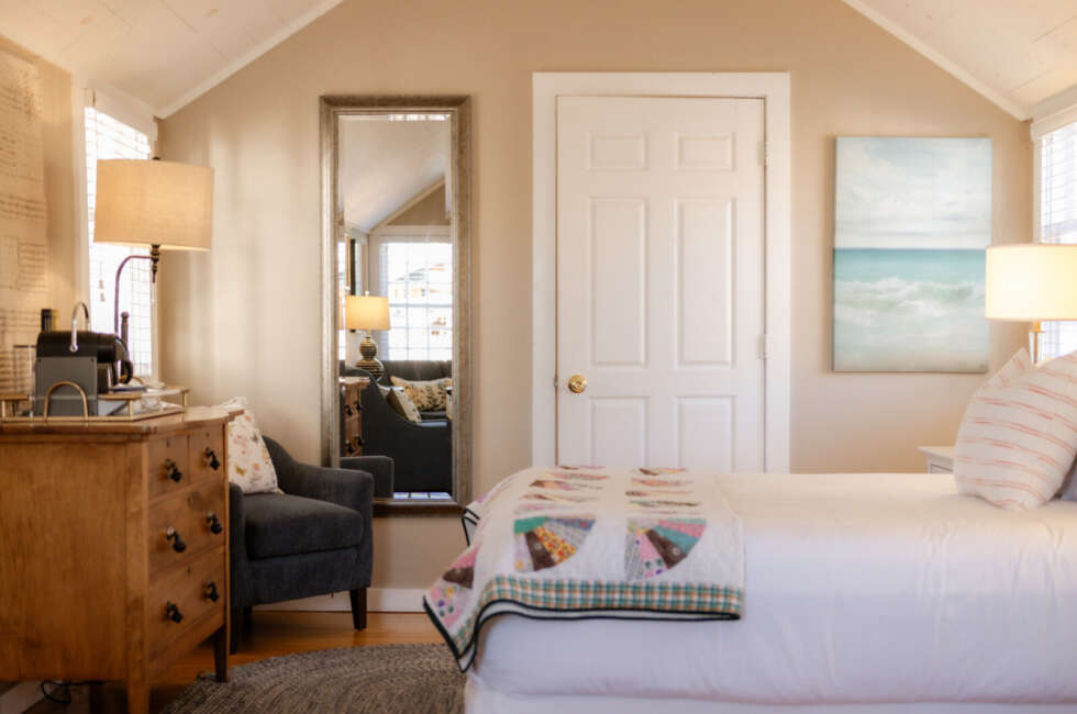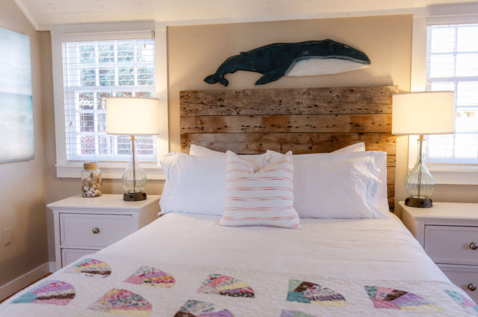 NEW: Courtyard 5 features 1 Queen and 1 Double bed. Our Classic Courtyards 1, 2, 3, 4, and 5 are all original to the property. Every room is unique and overlooks our gorgeous Courtyard and Inn property. At the turn-of-the-20th century, silent screen actors and playwrights spent their summers here enjoying our beautiful village. Courtyard 5 features a unique layout, propane fireplace, bespoke art pieces and coastal charm. Room rates are based on double occupancy. $600-$650/night.