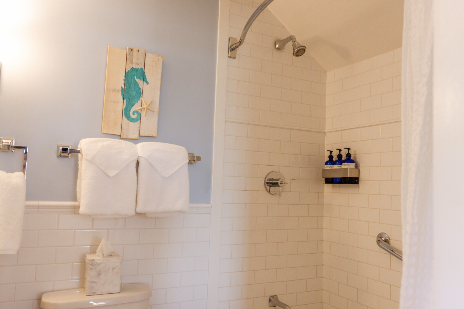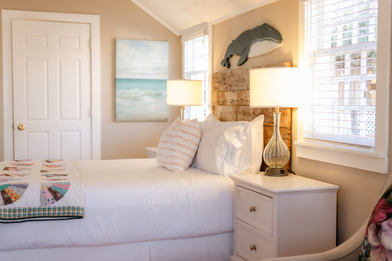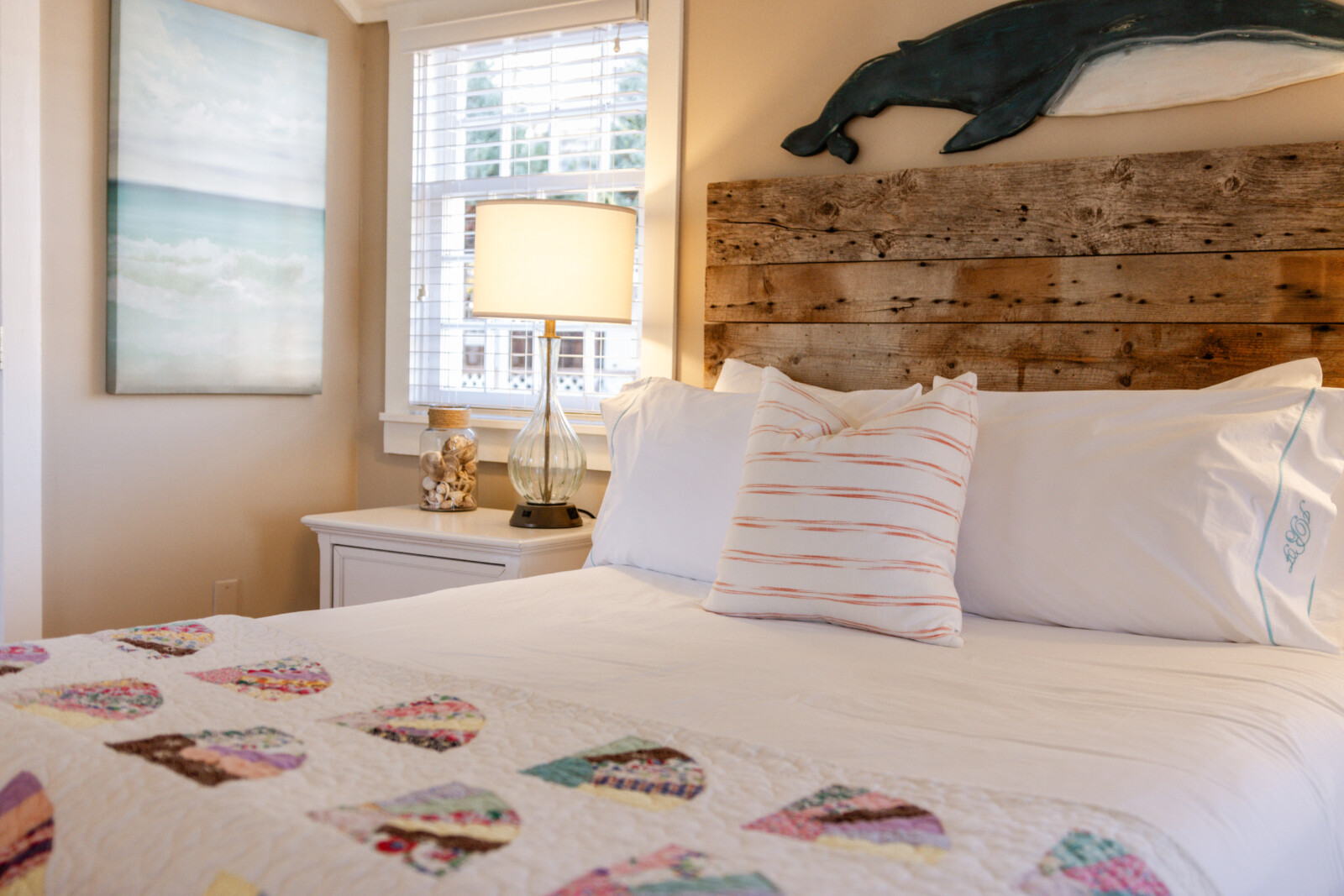 NEW: Courtyard 5 features 1 Queen and 1 Double bed. Our Classic Courtyards 1, 2, 3, 4, and 5 are all original to the property. Every room is unique and overlooks our gorgeous Courtyard and Inn property. At the turn-of-the-20th century, silent screen actors and playwrights spent their summers here enjoying our beautiful village. Courtyard 5 features a unique layout, propane fireplace, bespoke art pieces and coastal charm. Room rates are based on double occupancy. $600-$650/night.