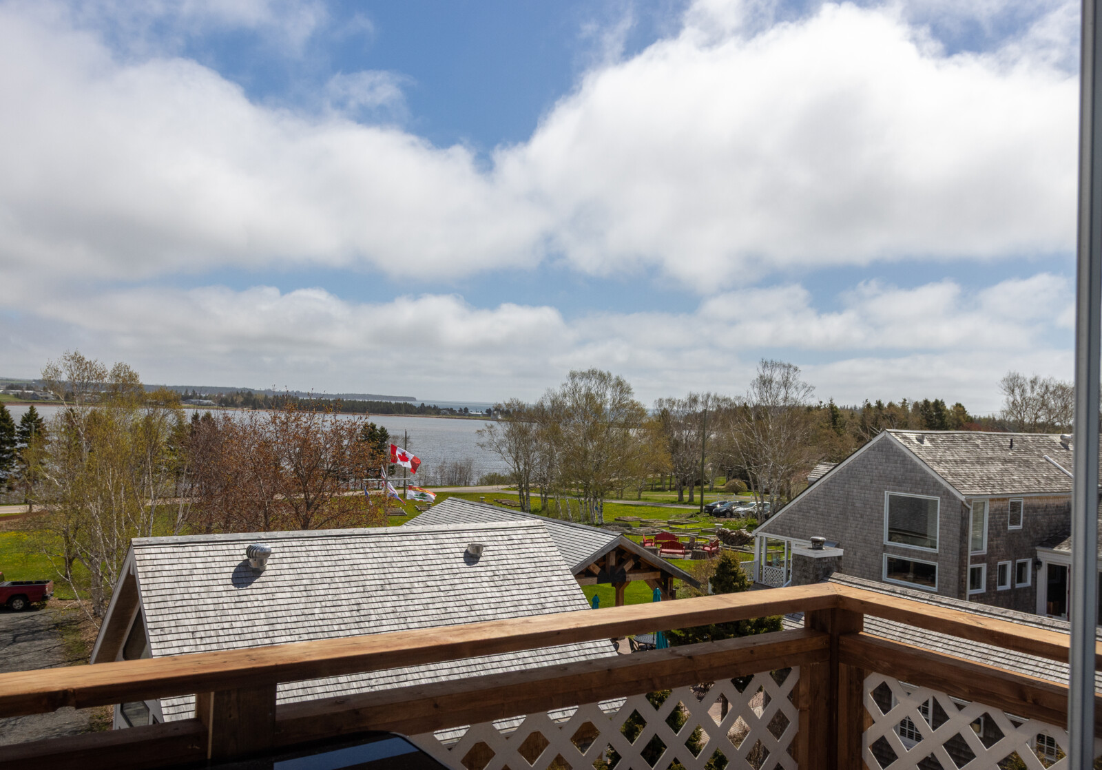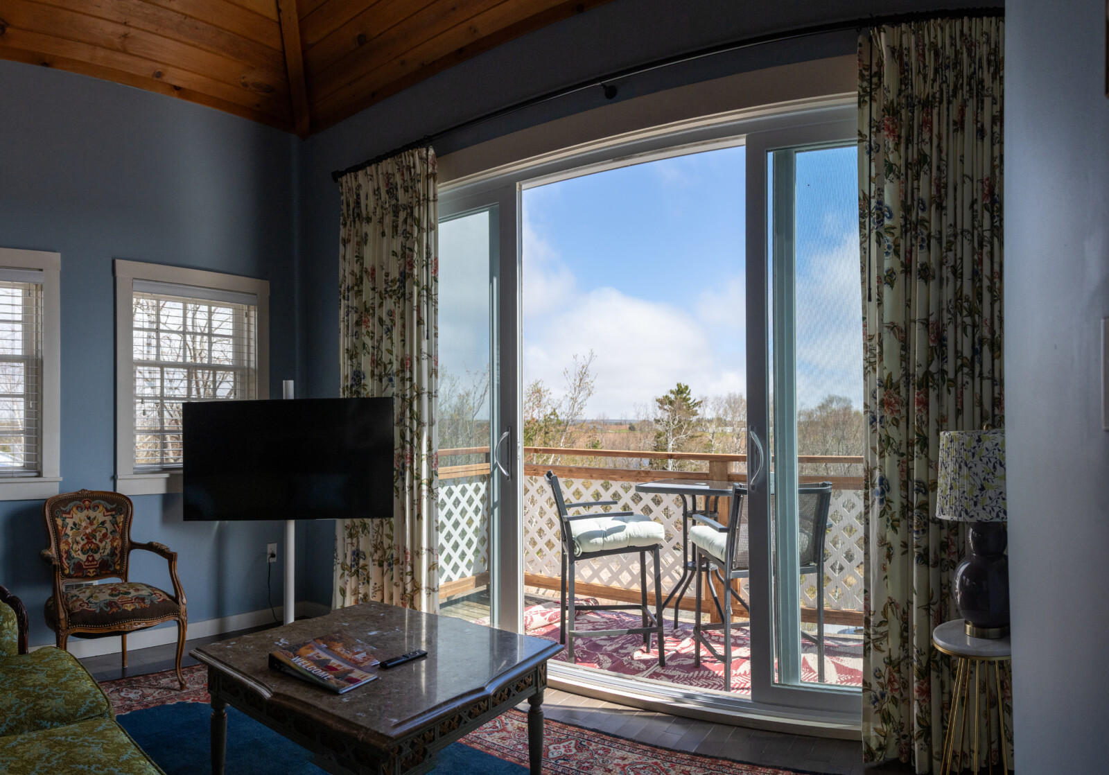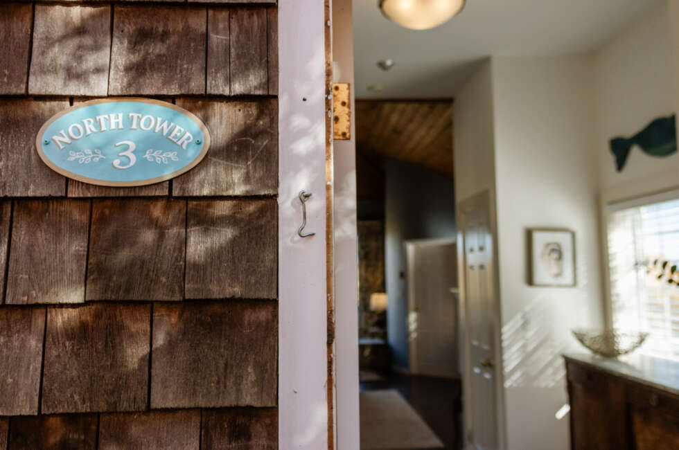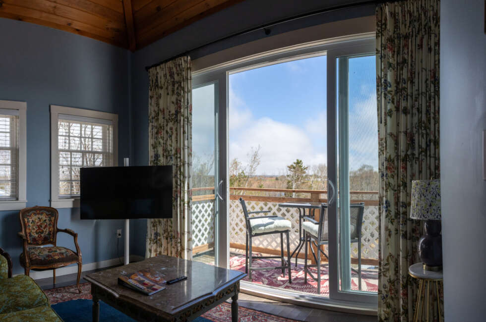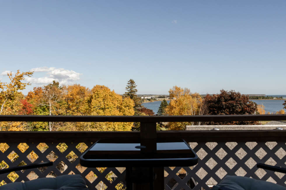 Our most luxurious room. Located at the top of the North Tower, it's spacious and blessed with a million-dollar view of our grounds and Fortune Bay. This room features cathedral ceilings, King-sized bed, propane fireplace, outdoor seating area and a large remodelled bathroom featuring a whirlpool bath and separate shower. Additional bedding: double pullout sofa and space for 2 cots. Room rates are based on double occupancy. $785-$850/night.